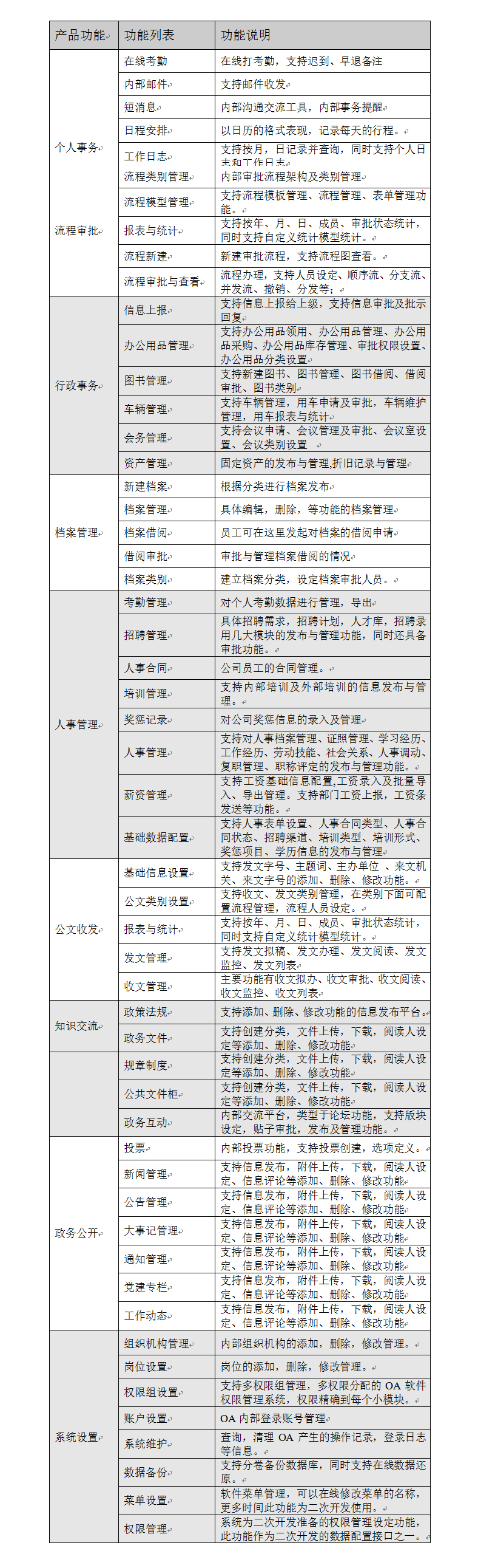 | 员工档案 | 2000元 | 员工档案、证照管理、学习经历、工作经历、员工关怀、人事调动、复职管理、基础模型管理 |